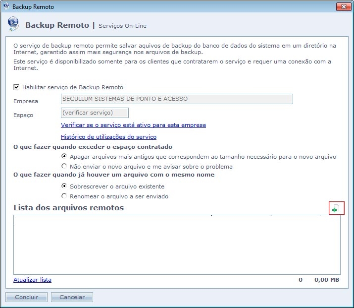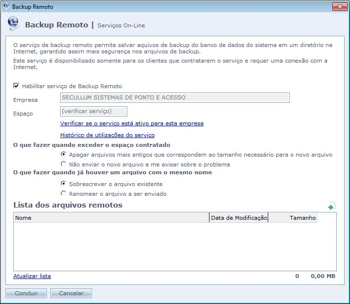 O serviço de backup remoto permite salvar arquivos de backup do banco de dados do sistema em um diretório na Internet, garantindo assim mais segurança nos arquivos de backup.