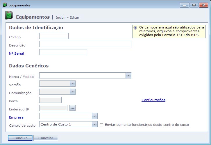 Centro de Custo: Centro de custo ao qual o equipamento está vinculado. Assinalando a opção "Enviar somente funcionários deste centro de custo" o sistema irá enviar somente os funcionários vinculados ao centro de custo selecionado. O campo Centro de Custo é habilitado somente quando há um centro de custo cadastrado no sistema. O campo "Enviar somente funcionários deste centro de custo" será habilitado somente quando estiver selecionado algum centro de custo.