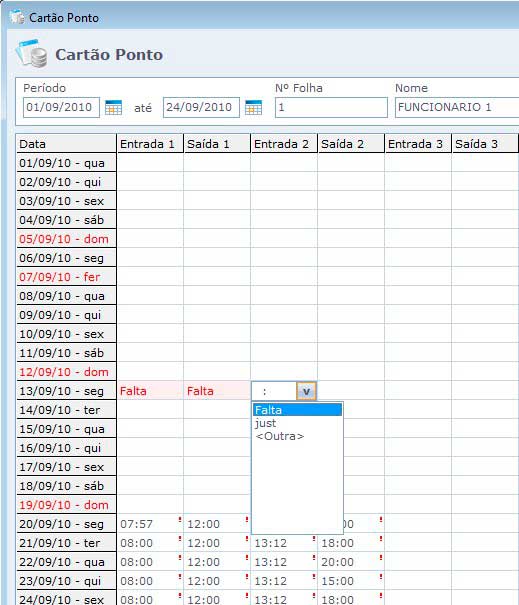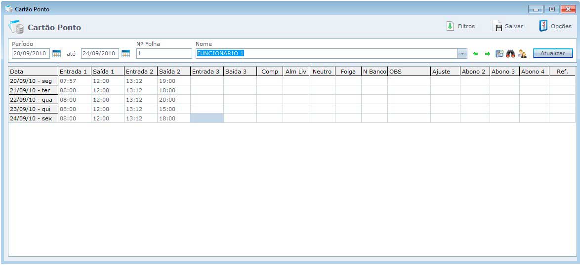 No Cartão Ponto é possível visualizar todos os registros coletados pelo equipamento, de cada funcionário de qualquer mês, (atual ou passado) podendo efetuar também a manutenção necessária de qualquer registro coletado ou não.