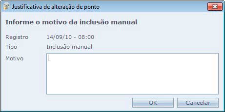 De acordo com a Portaria 1510, você deve descrever o motivo desta inclusão manual de registro de ponto. Toda vez que você alterar alguma marcação, esta janela será aberta.