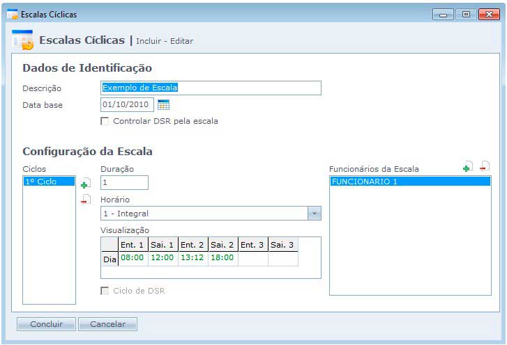 Ciclos:Ciclos são os diferentes horários que a escala pode fazer. Ou seja, quando o funcionário tiver uma troca de horário, será necessário um outro ciclo. Para incluir um novo ciclo, clique no botão ao lado do Horário. Para remover, clique em cima do ciclo e depois clique no botão