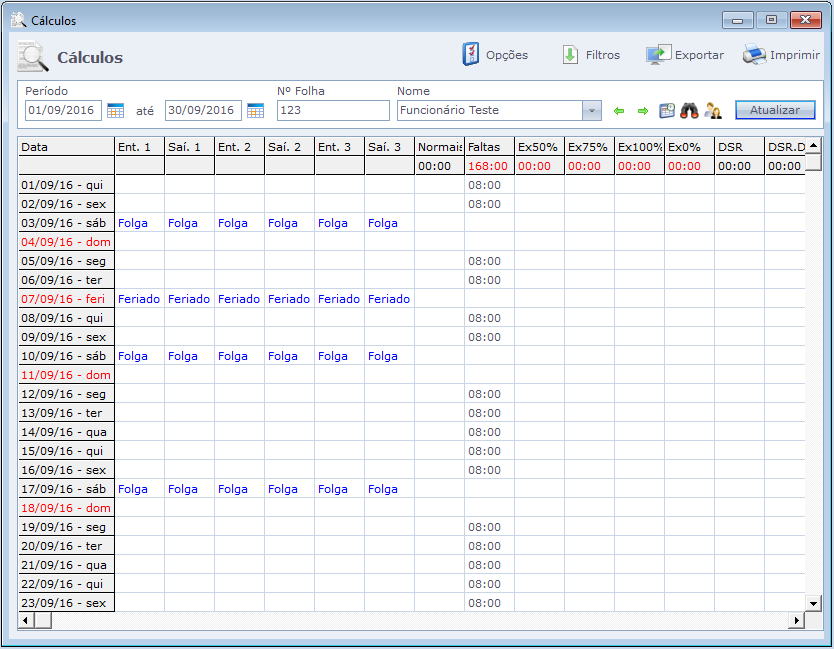 Nas linhas temos os dias, as batidas e os resultados dos cálculos. Nas colunas temos os variados tipos de cálculos.