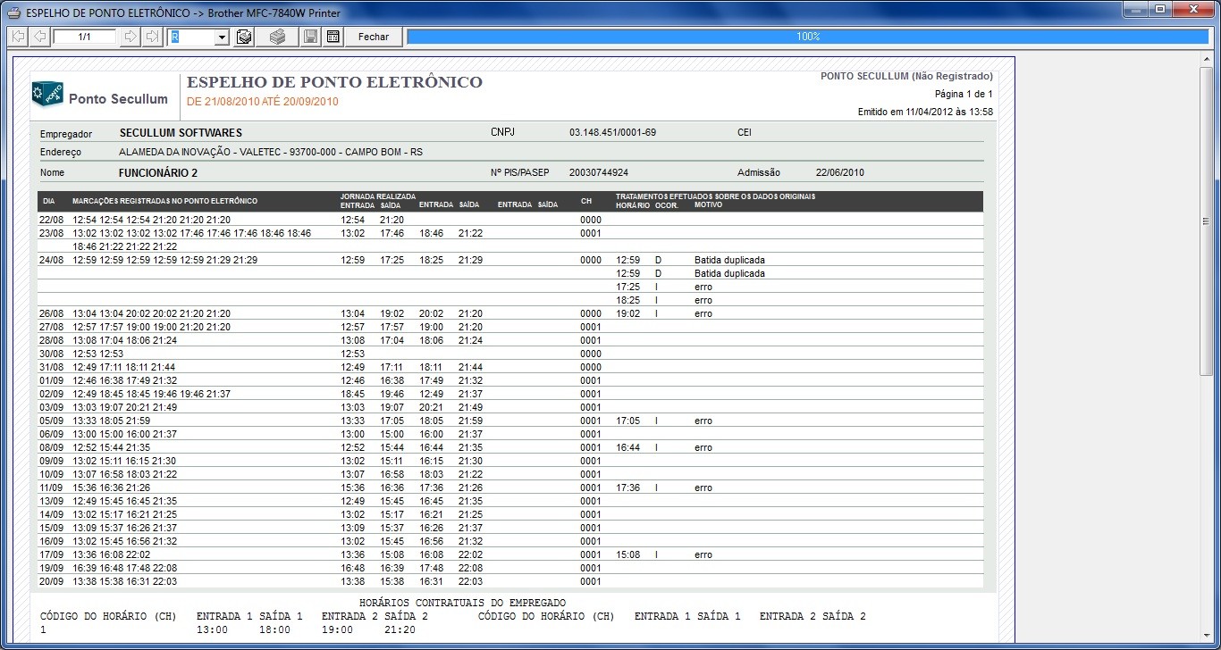 Miniatura do Horário: Impressão do quadro de horário do funcionário no cabeçalho do relatório.