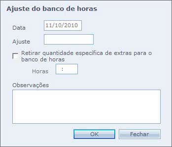 Lançar ajuste no banco de horas: Ajusta o saldo do banco de horas. Podendo ser lançado valor negativo ou positivo.