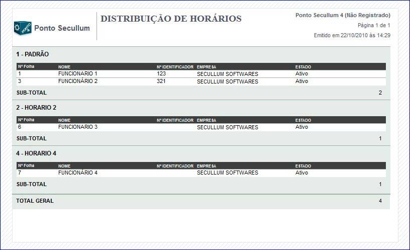 Horários: Exibe relatório de todos os funcionários agrupados por Horário.
