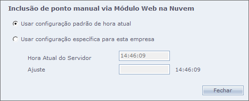 Configuração do Módulo Web na Nuvem: Permite que seja ajustada uma "hora atual" específica para a Empresa. Esta hora será utilizada na inclusão de ponto manual via Módulo Web na Nuvem. Sendo assim, o sistema pode controlar diversas empresas, cada uma em um fuso horário diferente, por exemplo.