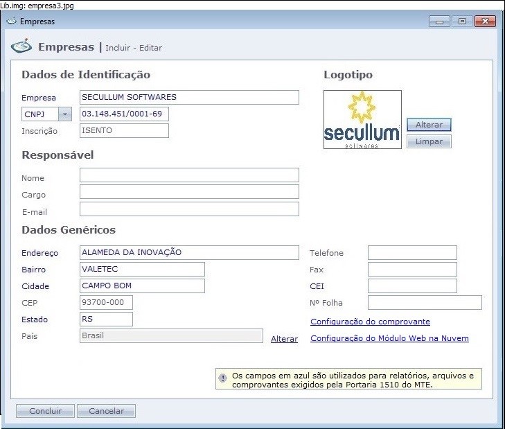 No cadastro da Empresa, em geral, os campos marcados em azul, são os campos que a Portaria 1510 exige que sejam cadastrados. São eles: