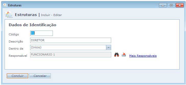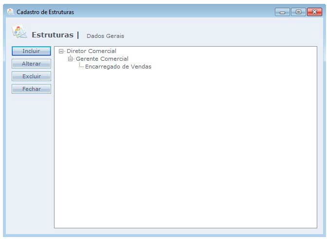 Exemplo: O Diretor Comercial, foi selecionado Início, por não existir estrutura superior cadastrada. No caso de Gerente Comercial, foi selecionado Diretor Comercial, pois estão ambos subordinados à mesma estrutura. No caso do Encarregado de Vendas, foi selecionado Gerente Comercial, pois é a estrutura a qual está subordinado.