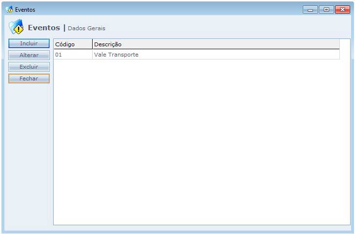 Nesta tela são cadastrados os eventos usados nos programas de Folha de Pagamento (sistema terceirizado). São cadastrados nesta tela Vales, Ordens, Adiantamentos em geral, etc.
