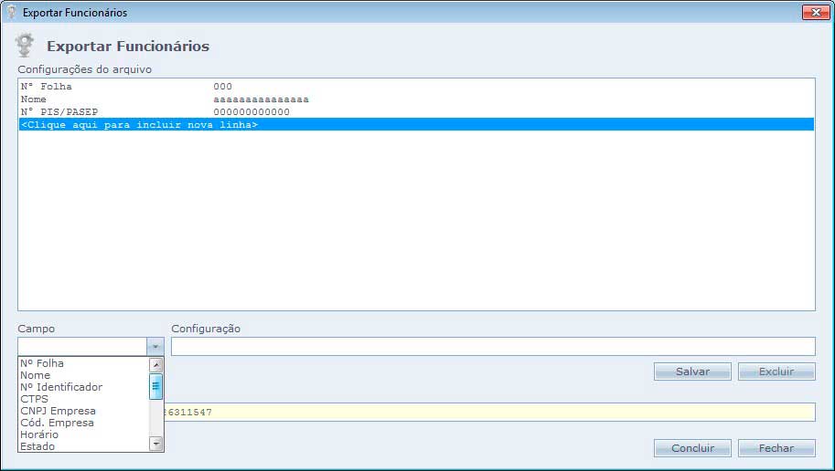 Acima eu cadastrei o campo Nº Folha e em configuração digitei "000", significa que meu campo Nº Folha terá 3 dígitos.
