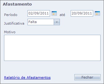 Justificativa: Justificativa do afastamento. Exemplos: Férias, Falta, Médico.