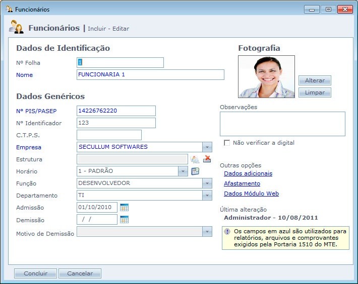 Nome:Nome do funcionário. Este campo é obrigatório e é enviado para o REP.