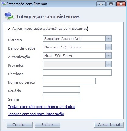 Sistema: Seleção do sistema compatível que será integrado ao Ponto Secullum 4. Atualmente estão disponíveis os sistemas Secullum Acesso.Net e Secullum Mini Folha.NET.
