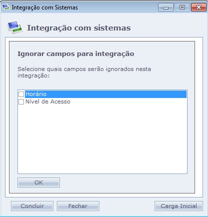 Ignorar campos para integração: Seleção de campos que não são atualizados no sistema selecionado. Caso o usuário altere esses campos no Ponto 4, eles não serão alterados no sistema integrado.