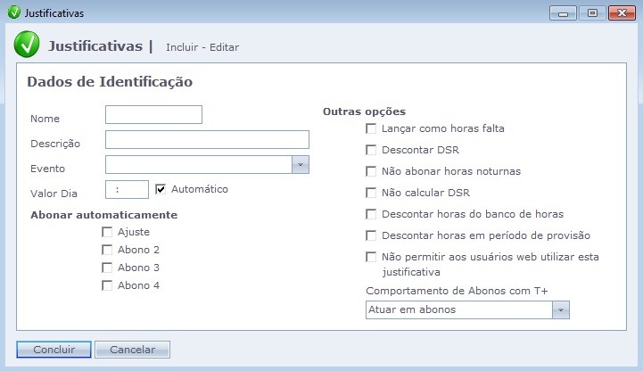 Valor Dia: Permite fixar um valor em horas para a justificativa. Deixando a opção Automático marcada, o sistema irá consultar a carga horária da pessoa para determinar o Valor Dia.
