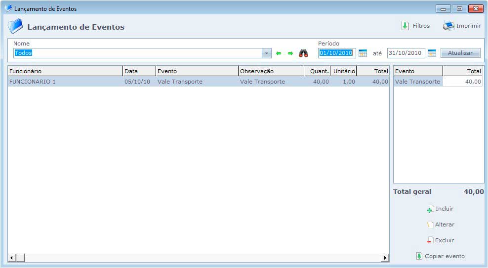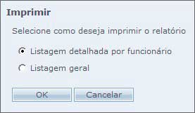 Imprimir: Emite relatório dos eventos lançados no período. Podendo ser impresso detalhado por funcionário, ou um relatório geral.