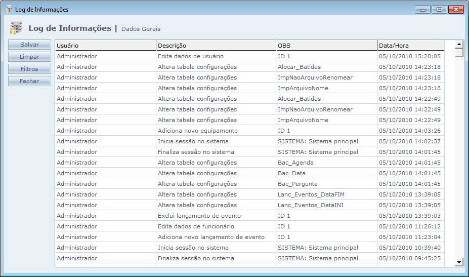 Registro das modificações feitas pelos usuários, acessos ao sistema, entre outras informações úteis a administradores do sistema.