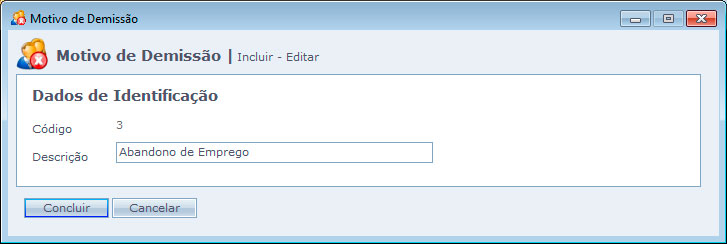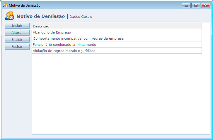Cadastro de motivo de demissão do funcionário. Estes motivos serão utilizados no cadastro de funcionários.
