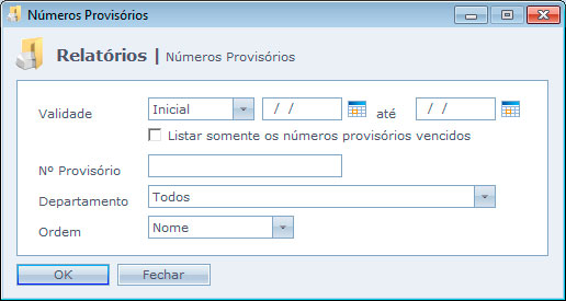 Relatório onde você pode consultar os números provisórios que estão em uso no sistema e/ou os vencidos. Pode ser filtrado por Validade, Número Provisório e Departamento e ainda ordenado por Nome ou Nº provisório.