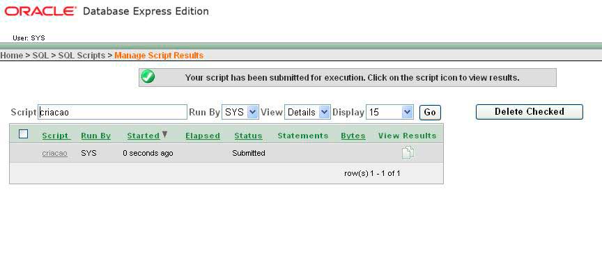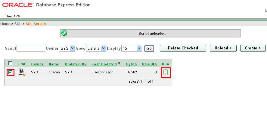 o Selecione o script de criação. Após selecioná-lo clique no semáforo, na coluna Run.