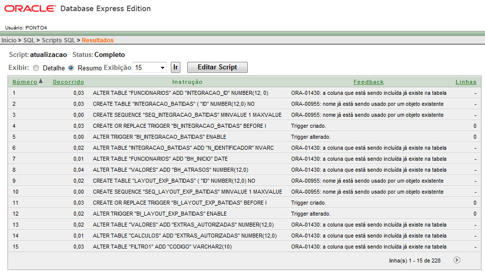 o Após a conclusão da atualização, clique em Exibir Resultados para visualizar os resultados da execução do script. Caso tenha sido executado com sucesso, a tela abaixo será exibida.