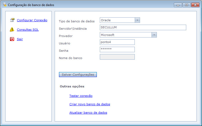 Nome do banco: Nome do banco de dados do sistema, por padrão PontoSecullum4.