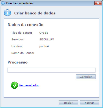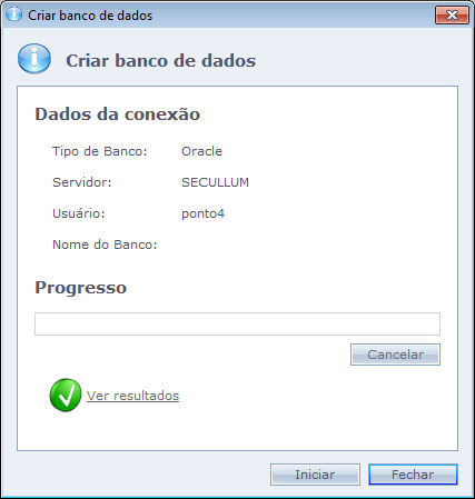 o Após efetuar as configurações do servidor de banco de dados, clique em 'Criar novo banco de dados'. Clique em Iniciar para dar início a criação do banco de dados.