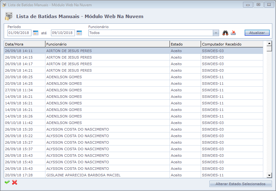 Esta opção permite visualizar as batidas manuais realizadas via Módulo Web na Nuvem dentro de um determinado Período e alterar o Estado destas batidas caso desejado.