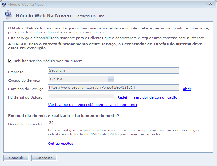 OBS: Após este período de carga inicial, o sistema enviará automaticamente os cálculos de ponto para o servidor da Secullum, sendo necessário apenas que o Gerenciador de Tarefas do Ponto 4 esteja em execução.