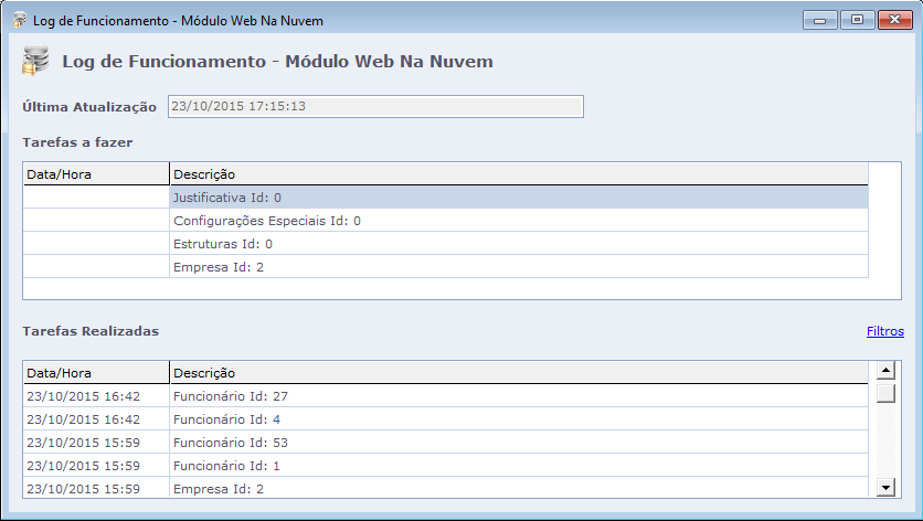 Ao clicar no link log de funcionamento de serviço é exibido uma tela com a data da última atualização das tarefas pendentes e realizadas, informando a data, a hora e descrição das tarefas.