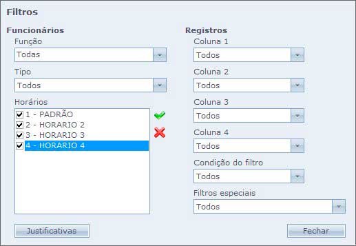 Filtros Especiais: Filtros especiais da tela de Ponto Diário.