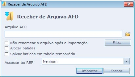 Arquivo AFD: Selecione o arquivo AFD utilizando o ícone , ou cole o caminho do arquivo no campo.