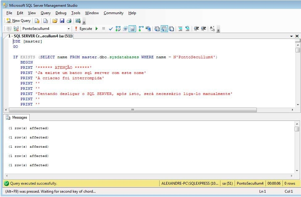 o Ao final da execução o 'SQL Management Studio' irá mostrar abaixo na tela as mensagens informando se o script foi executado com sucesso ou não. Se o script foi executado com sucesso, você verá uma tela como a que segue abaixo.