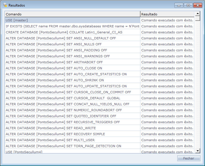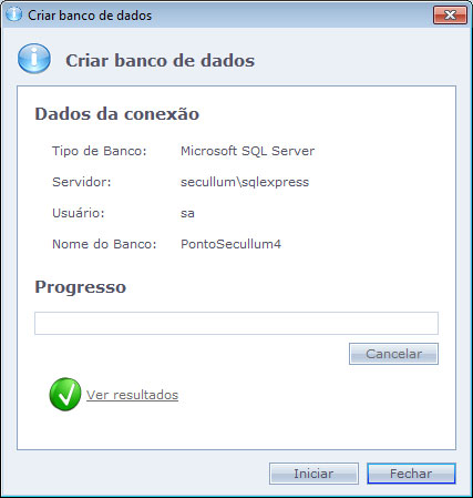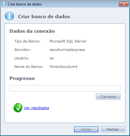 Ao concluir a instalação, o banco de dados do Ponto Secullum 4 é criado automaticamente. Se tudo estiver correto, será exibida a mensagem Processo concluído com êxito. Caso tenha ocorrido algum problema na instalação ou na criação do banco de dados, você pode conferir o que ocorreu em Ver resultados.