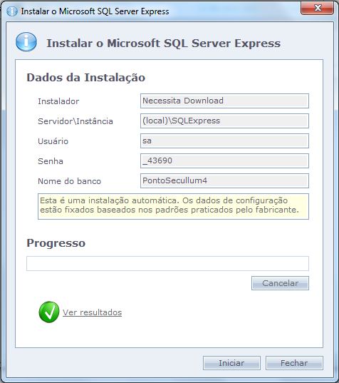 Caso ainda não haja um SQL Server instalado, é possível fazer a instalação pela opção Instalar o Microsoft SQL Server Express. Após clicar em Iniciar, é feito o download do instalador do Microsoft SQL Server 2008 Express (versão gratuita) e, após concluído o download, a instalação é feita automaticamente com os valores padrões de instalação, conforme a imagem abaixo.