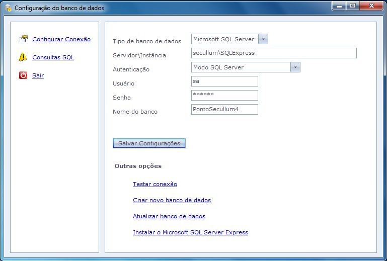 Nome do banco: Nome do banco de dados do sistema, por padrão PontoSecullum4. É permitido alterar o nome.