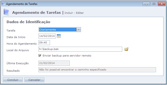 Tarefa não executada devido a um erro, campo "Resultado" exibe o motivo:
