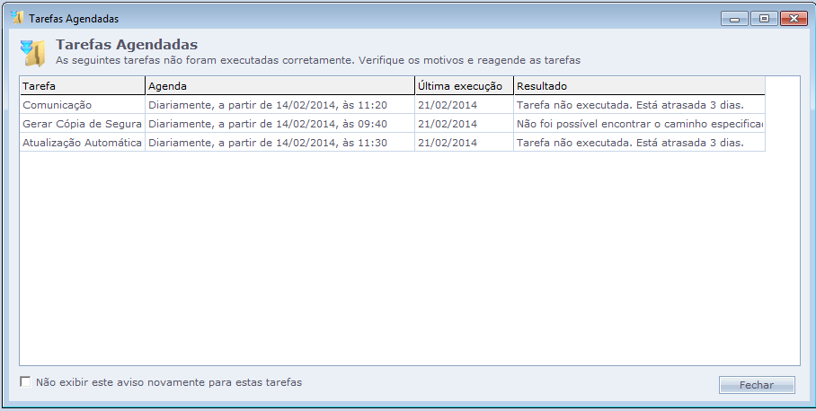 Não exibir este aviso novamente para estas tarefas: Marcando esta opção, o sistema irá considerar as tarefas da tela como "lidas" pelo usuário e não serão mais exibidas ao abrir o sistema. Neste caso, elas somente serão mostradas na tela quando forem executadas novamente e ocorrer algum problema.