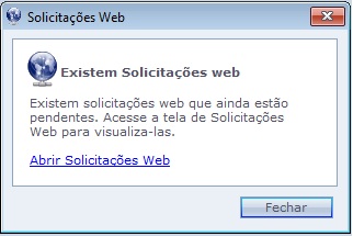 Está tela é exibida quando um funcionário ou responsável realiza solicitações de alteração de ponto no Módulo Web e no Módulo Web na Nuvem. O Link "Abrir Solicitações Web" tem por objetivo direcioná-lo para a tela de solicitações web pendentes.