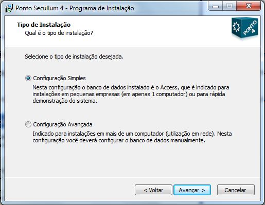 Configuração Simples: Nesta configuração o sistema será instalado de forma automática com banco de dados Access.