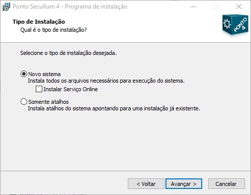 o Selecione a opção “Novo Sistema” para uma nova instalação. Caso esteja instalando um atalho de rede para uma instalação em outro computador, selecione “Somente atalhos”.