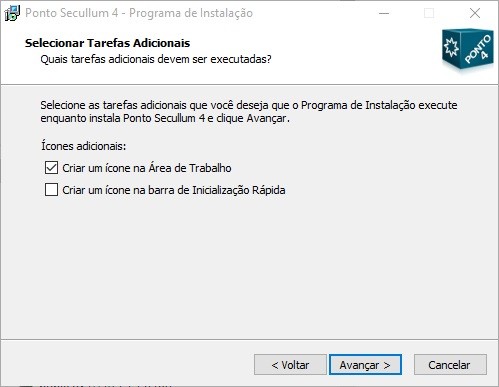 o Na tela seguinte o instalador pergunta se deseja criar ícone do sistema na Área de Trabalho e/ou criar um ícone na barra de Inicialização Rápida.