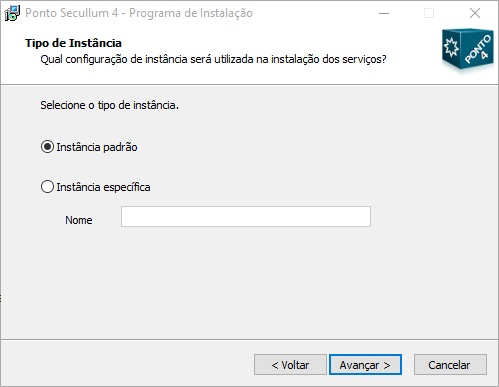Instância específica: Nesta configuração pode-se definir o nome da instância a ser utilizada na instalação dos serviços. A instância específica possibilita ter duas ou mais instalações do Ponto Secullum 4 no mesmo computador, sendo cada uma com serviço Online e Gerenciador de tarefas atuando de forma independente.