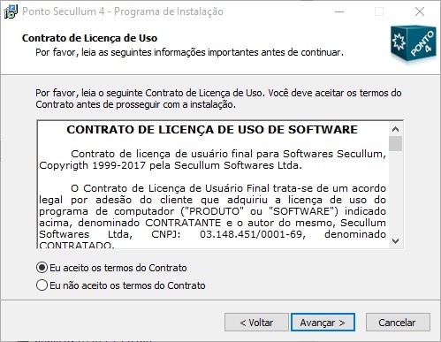 o Na próxima tela é exibido o Contrato de Licença de Uso do Ponto Secullum 4, leia este contrato, após isto marque a opção 'Eu aceito os termos do Contrato' e clique e Avançar para dar continuidade a instalação.